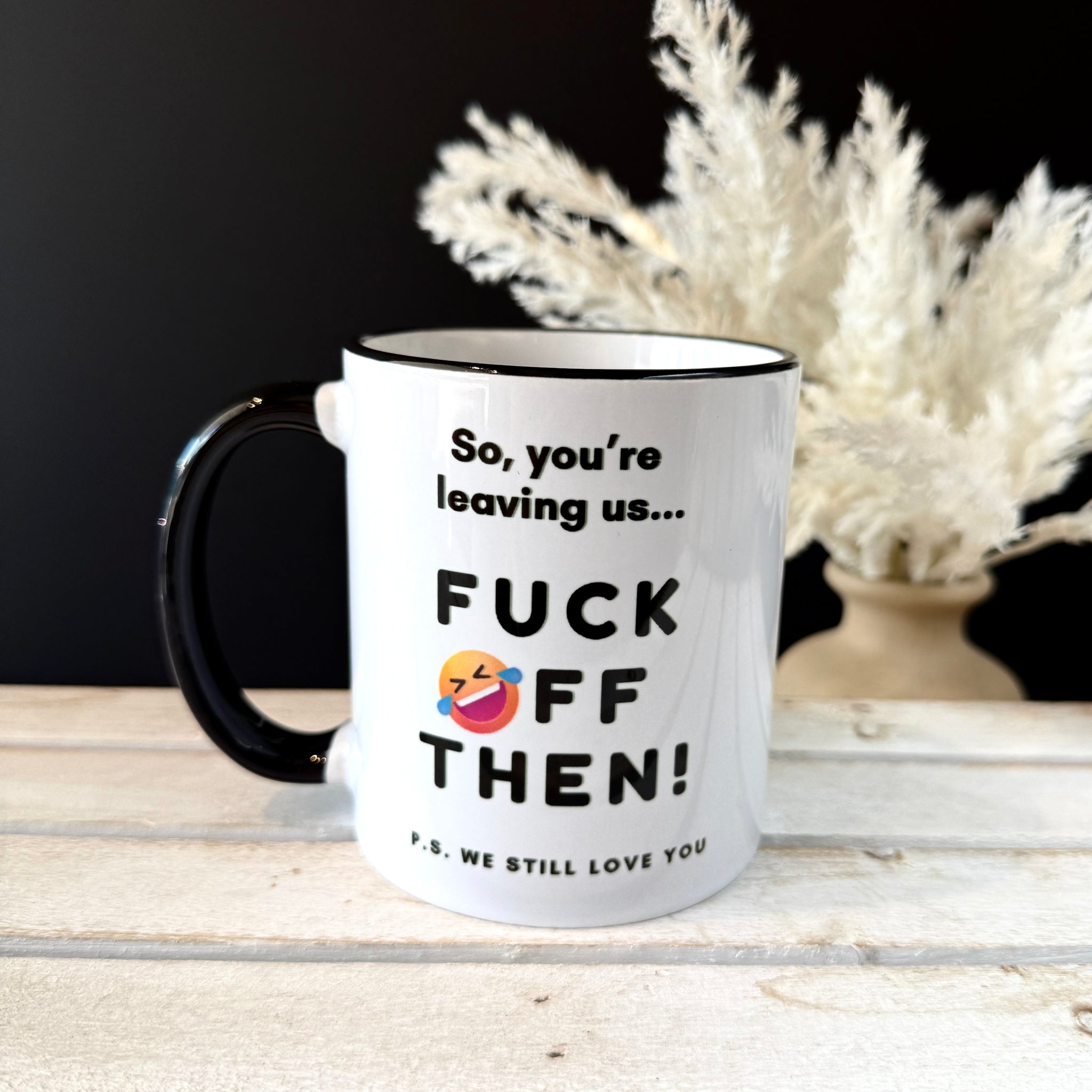 They got a new job, a new life, or just finally escaped the toxic group chat - whatever the reason, give them the perfect send-off with this hilariously offensive "So you're Leaving Us? Fuck Off Then" Mug.